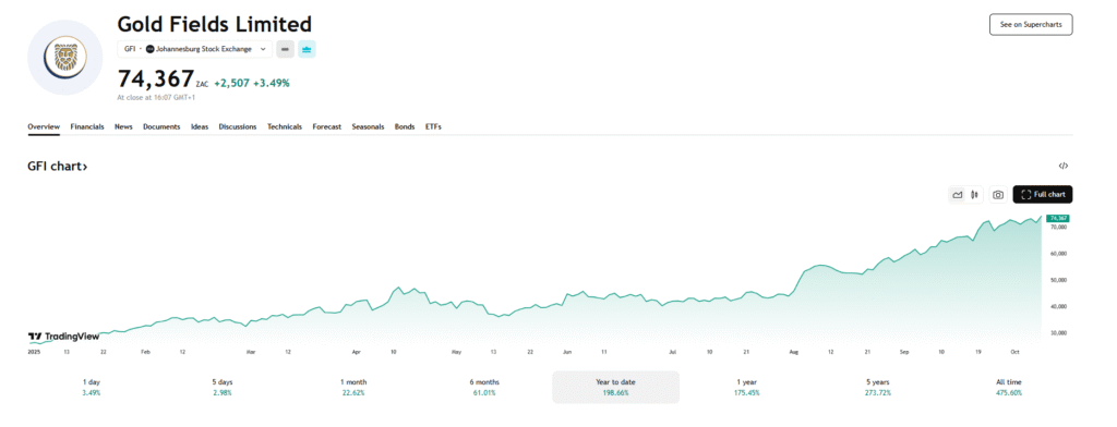 The company’s rise this year has been striking. Its stock has climbed from R261.97 ($15.26) in January to roughly R732.95 ($42.72) by the close of market activities on October 8, 2025 , driving its market capitalization from R230 billion ($13.4 billion) to R643 billion ($37.47 billion). That nearly $25 billion increase marks the largest gain among African miners in 2025.