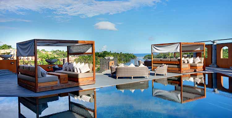 The infinity pool is the most photographed corner of the hotel, a slim strip of water facing the lagoon, bordered by daybeds, cabanas and pergolas.