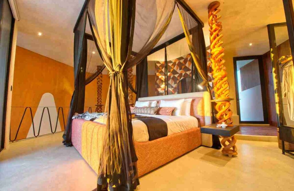 The design carries those influences into modern architecture, using textured exterior panels inspired by pangolin scales and earthy tones that mirror the surrounding landscape.