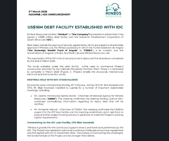 Minbos Resources lands $16 million IDC funding for Angola fertilizer project