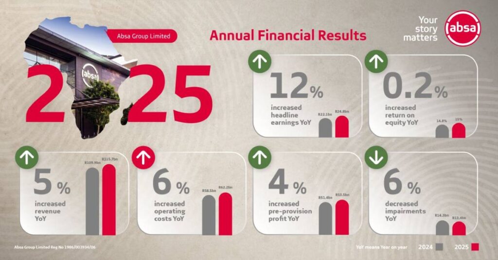 Absa, South Africa’s third-biggest lender, boosts headline earnings to $1.52 billion